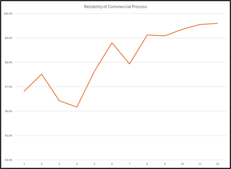 The Reliability of any process is the conformance percentage of each process step multiplied with each other.